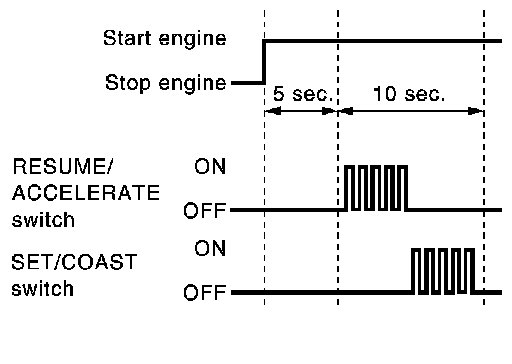 4. Wait 5 seconds after starting engine, then within 10 seconds, push up RESUME/ACCELERATE switch 5 times, and push down SET/COAST switch 5 times.