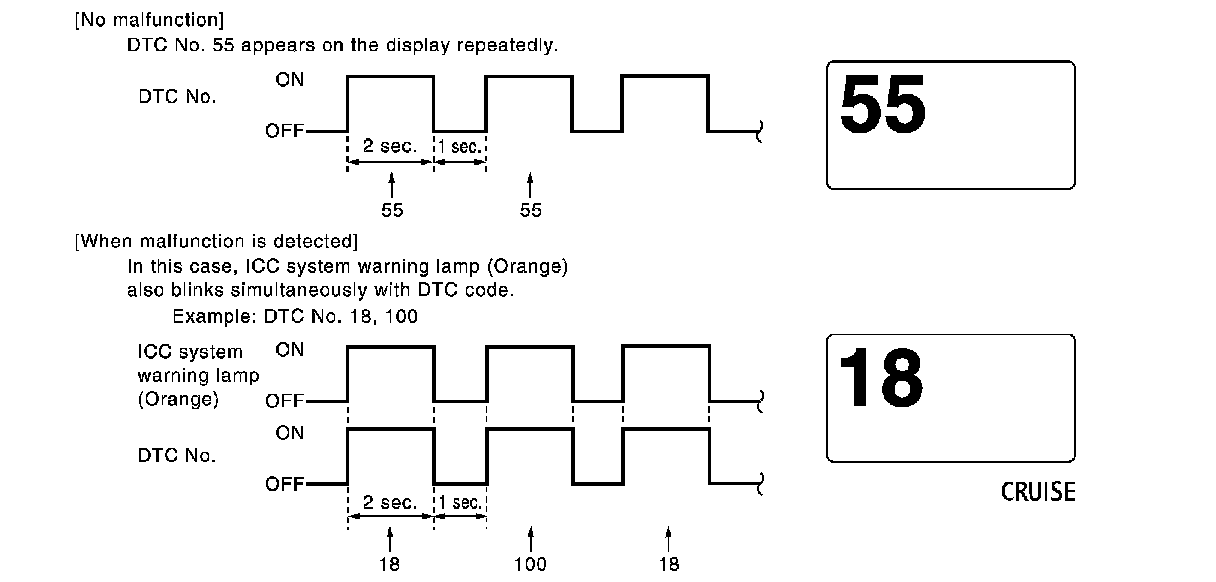 - 0: malfunction is detected at present (from malfunction detection to ignition switch OFF).