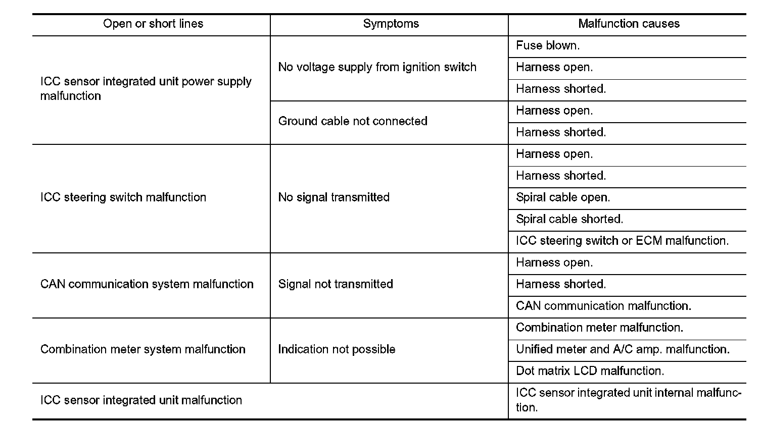- If self-diagnosis mode cannot be started after several attempts, the ICC sensor integrated unit may have had malfunction. Repair or replace it. Refer to "SELF-DIAGNOSIS BY DOT MATRIX LCD WILL NOT RUN".