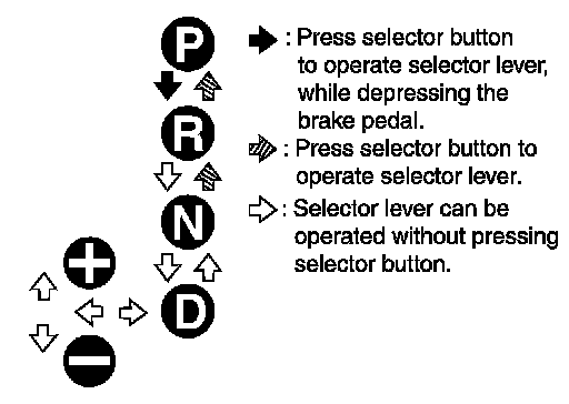 In addition, a set shift position must be changed when the selector lever is shifted to the "+" or "-" side in the manual mode. (Only while driving.)