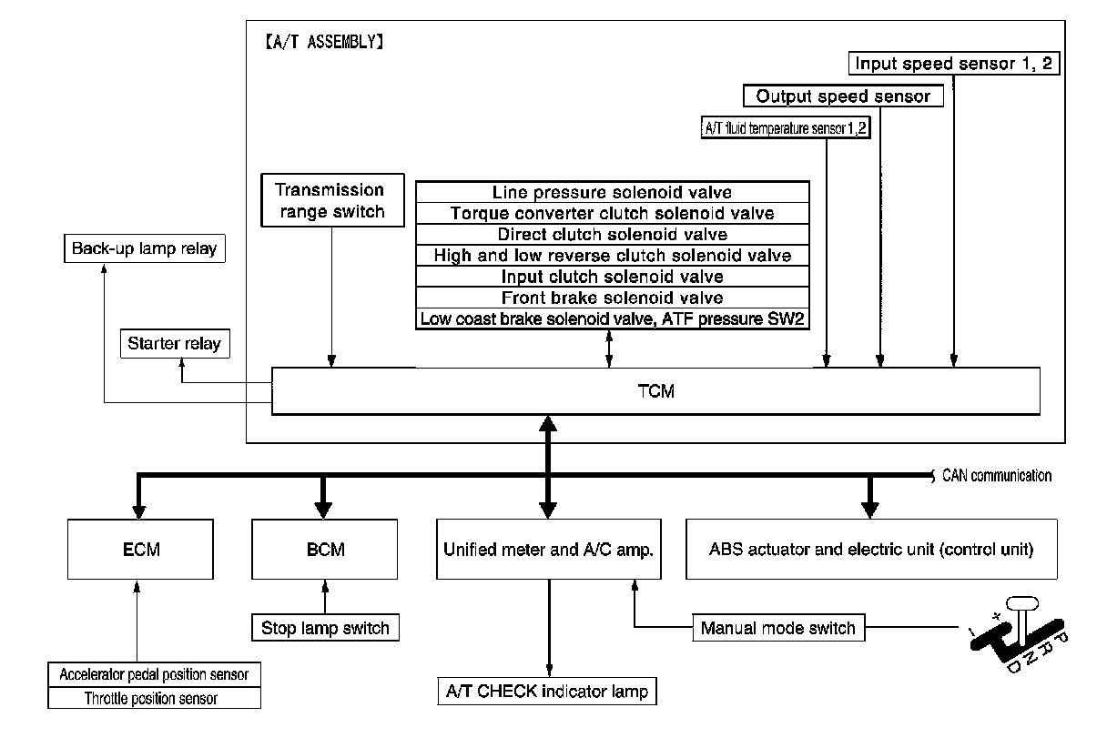 The A/T senses vehicle operating conditions through various sensors or signals. It always controls the optimum shift position and reduces shifting and lock-up shocks.