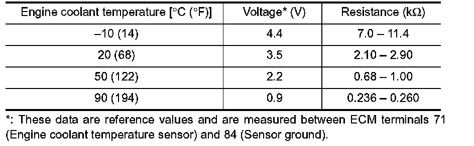 The engine coolant temperature sensor is used to detect the engine coolant temperature. The sensor modifies a voltage signal from the ECM. The modified signal returns to the ECM as the engine coolant temperature input. The sensor uses a thermistor which is sensitive to the change in temperature. The electrical resistance of the thermistor decreases as temperature increases.