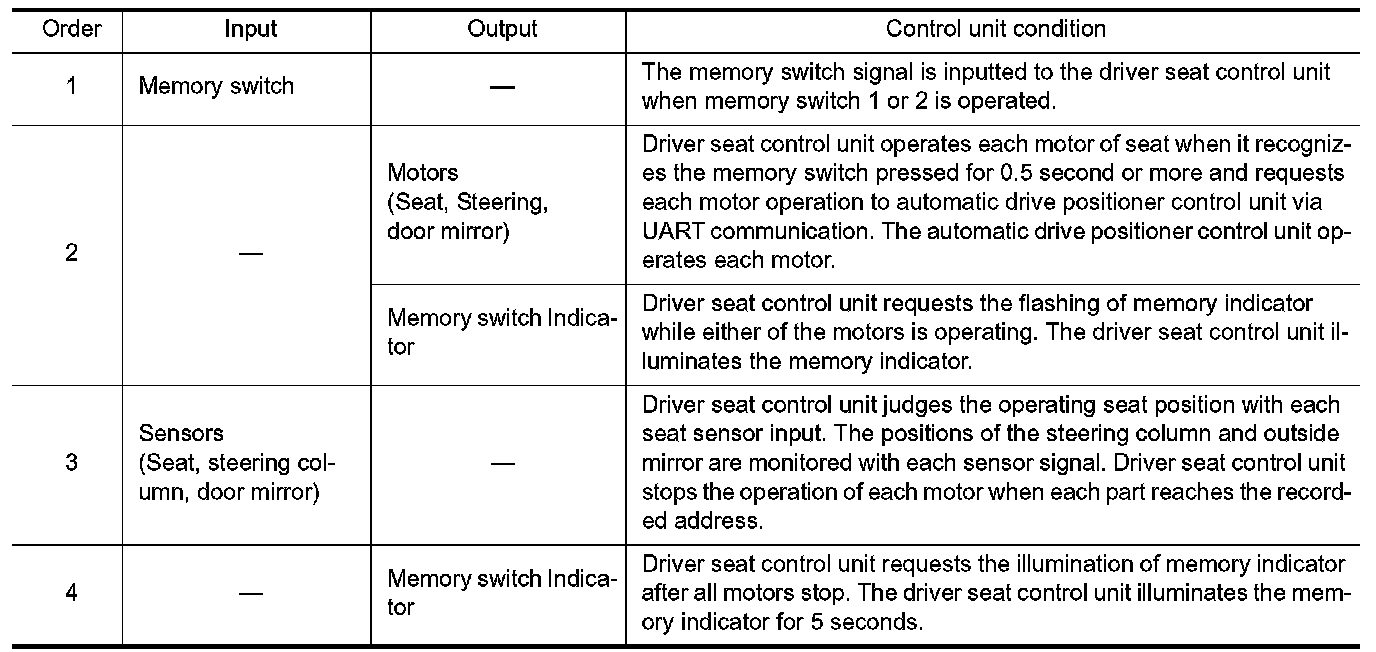 - The memory function can be performed for 45 seconds after opening the driver door even if the ignition switch position is in OFF position.