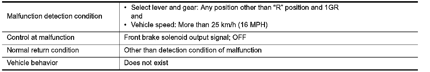 Controls the engine brake so as not to make effective by turning the front brake solenoid output to OFF when each solenoid becomes the electricity pattern of 1st engine brake during driving at the vehicle speed 25 km/h or more in any positions other than "R" position and 1GR.