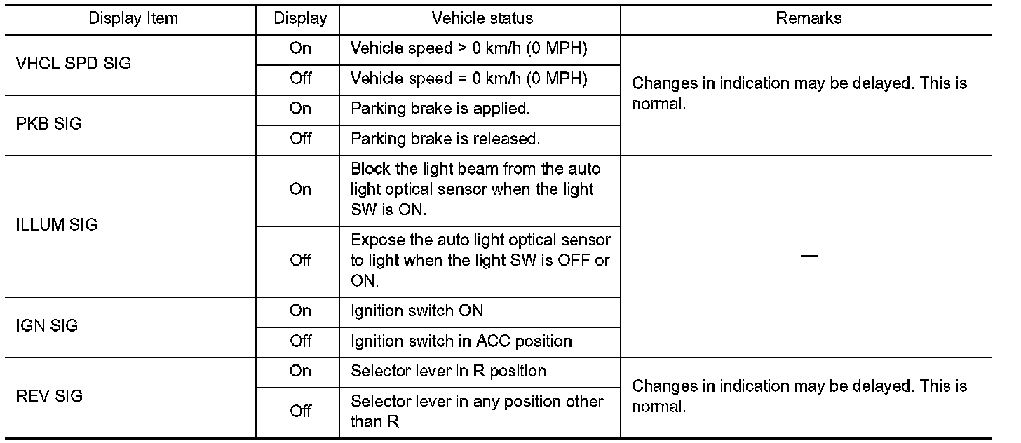 - Displays the status of the following vehicle signals inputted into the AV control unit.