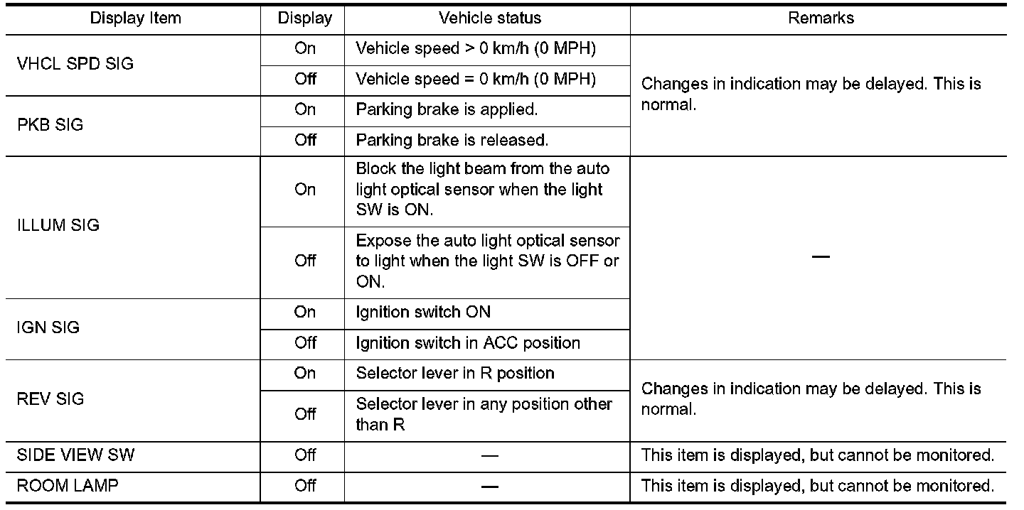 - Displays the status of the following vehicle signals inputted into the AV control unit.