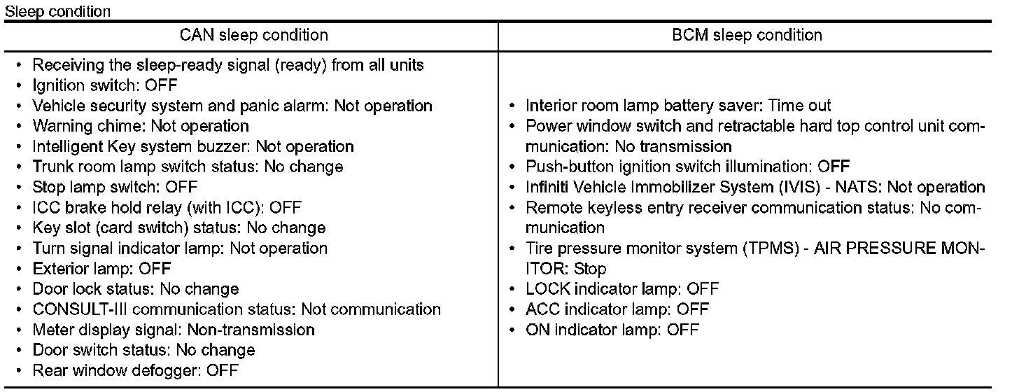 - BCM transmits the sleep wake up signal (sleep) to each unit when all of the CAN sleep conditions are fulfilled.