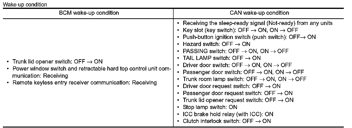- BCM transmits the sleep wake up signal (wake up) to each unit when any of the CAN wake-up conditions is fulfilled. It changes from the low power consumption mode or the CAN communication sleep mode to the normal mode.