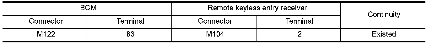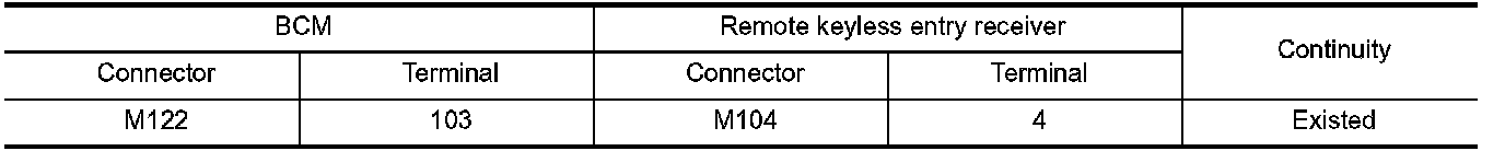 2.Check continuity between BCM harness connector and remote keyless entry receiver harness connector.