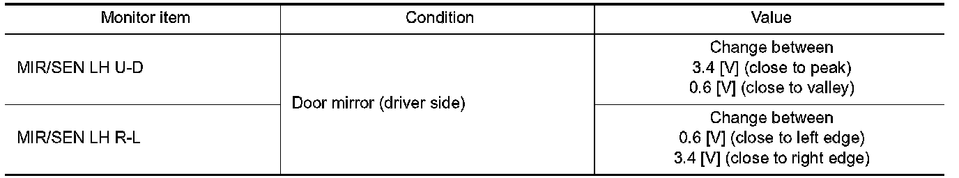 2.Select "MIR/SEN LH U-D", "MIR/SEN LH R-L" in the "Data monitor" using CONSULT-III.