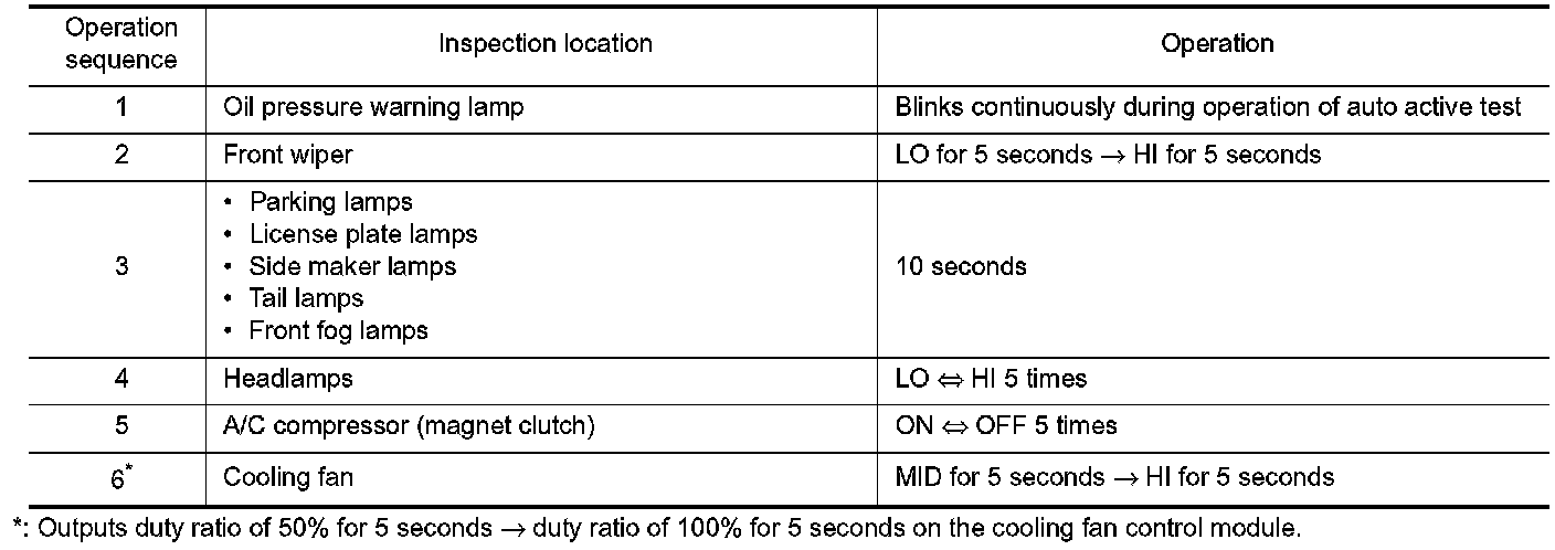 In auto active test mode, the IPDM E/R sends a drive signal to the following systems to check their operation.