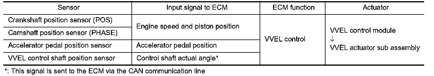 VVEL (Variable Valve Event & Lift) is a system that controls valve event and valve lift continuously. Rotational movement of the drive shaft equipped with eccentric cam is transmitted to output cam via the rocker arm and two kinds of links to depress the intake valve. ECM decides the target valve lift according to the driving condition and sends the command signal to the VVEL control module. The VVEL control module controls the rotation of the control shaft using the VVEL actuator motor and changes the movement of the output cam by shifting the link supporting point. As a result, valve lift changes continuously to improve engine output and response.