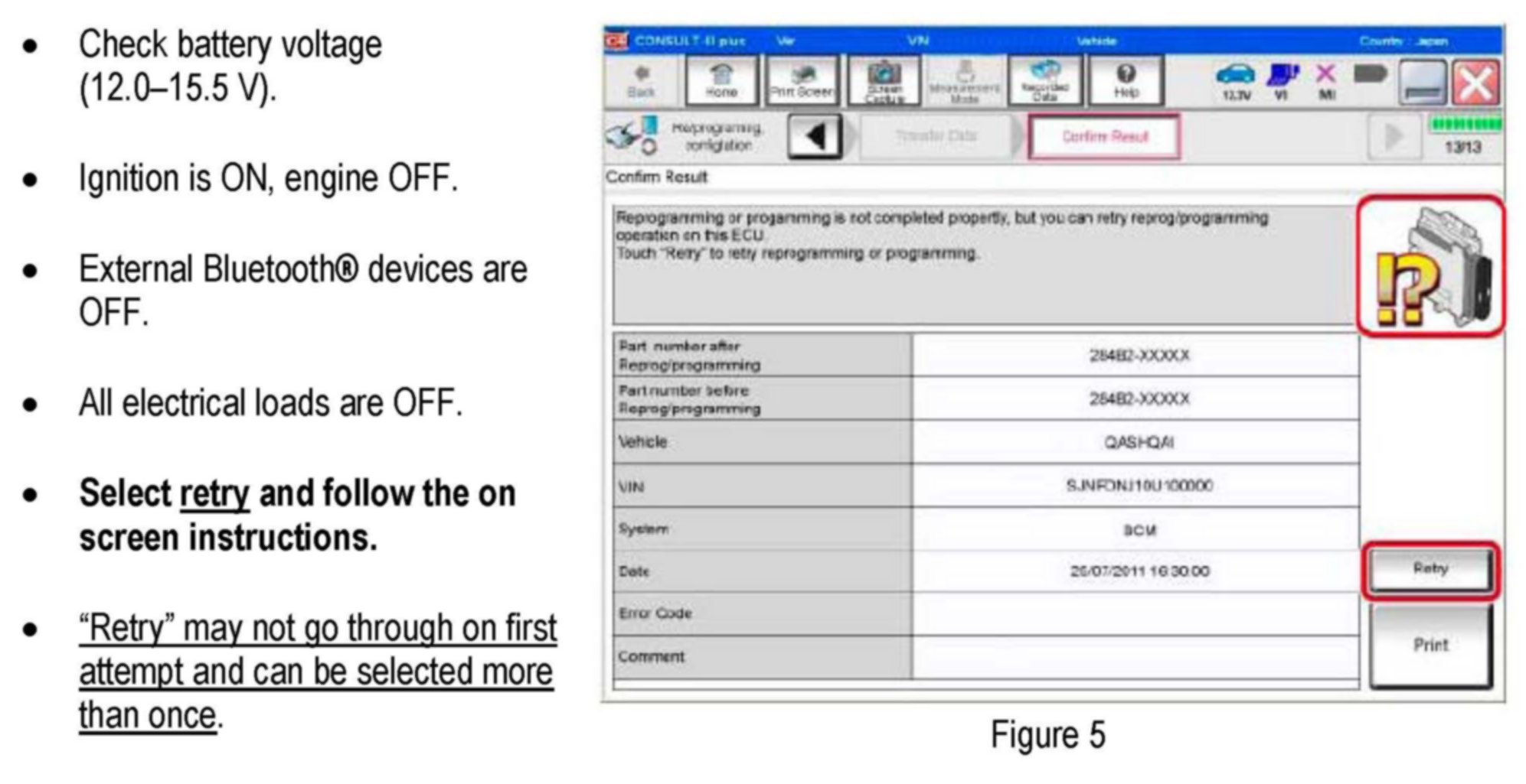 If reprogramming does not complete and the "!?" icon displays as shown in Figure 5 and information.