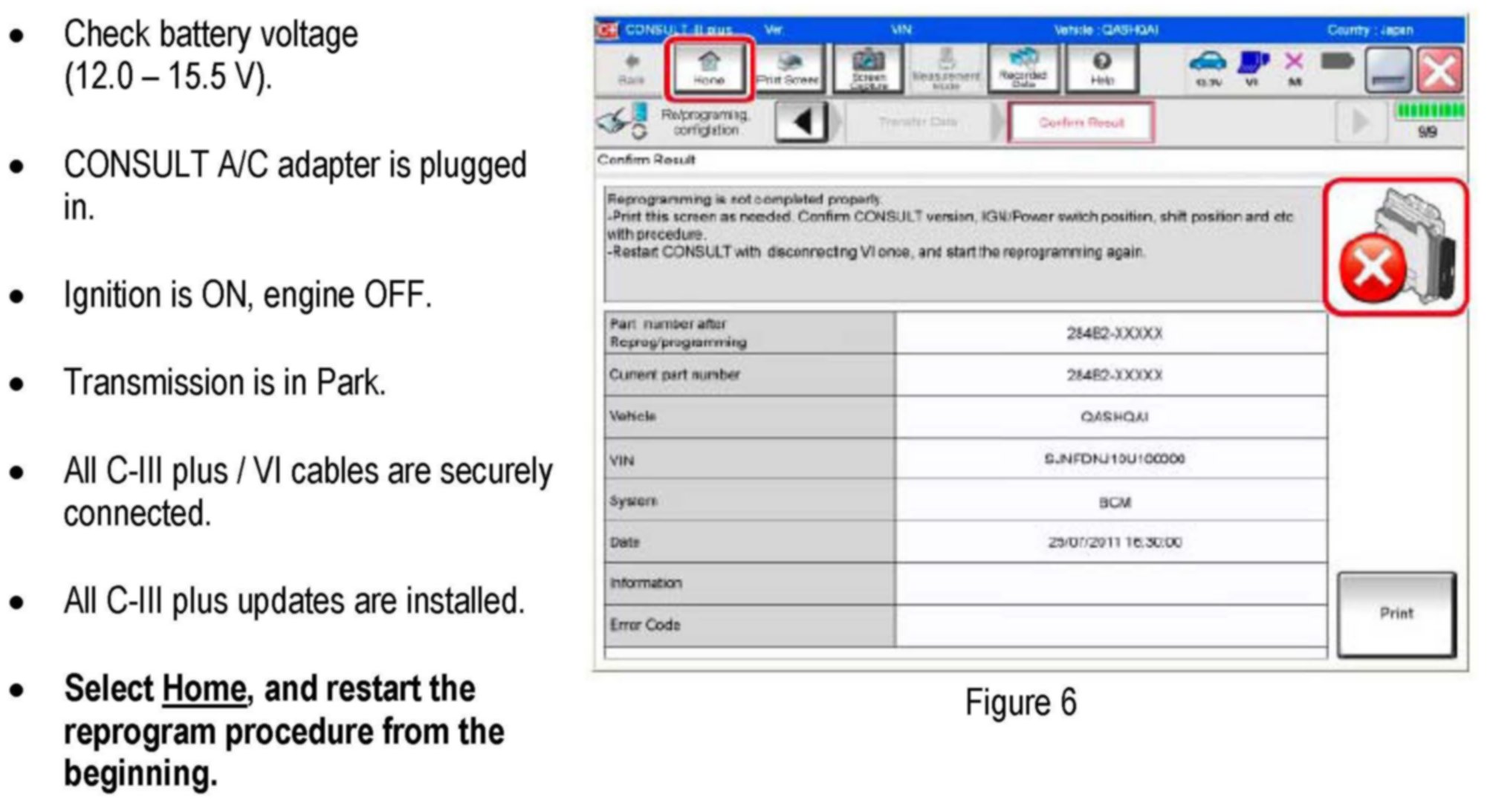 If reprogramming does not complete and the "X" icon displays as shown in Figure 6 and information.