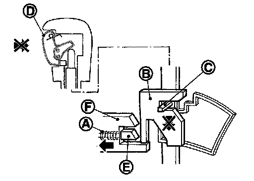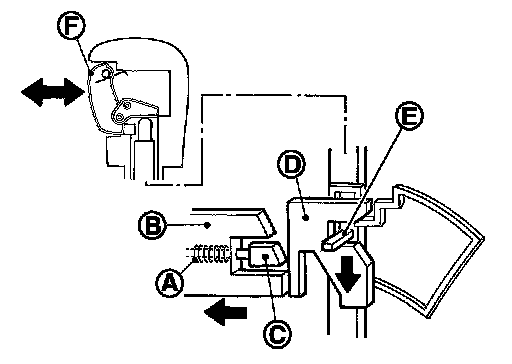 The lock plate (B) lowers according to the downward movement of the position pin (C) when the selector button (D) is pressed, and presses only slider B (E) into the shift lock unit. Slider A (F) located below the lock plate prevents the downward movement of the lock plate with the spring force. The selector lever cannot be shifted from the "P" position for this reason.