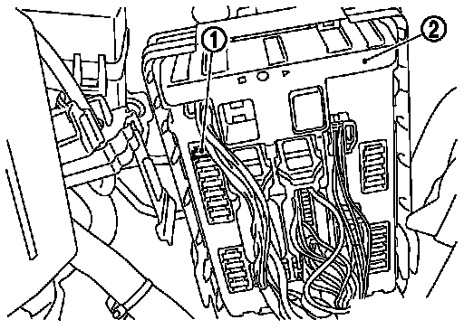 3.Disconnect fuel pump fuse (1) from IPDM E/R (2) to avoid fuel injection during measurement.