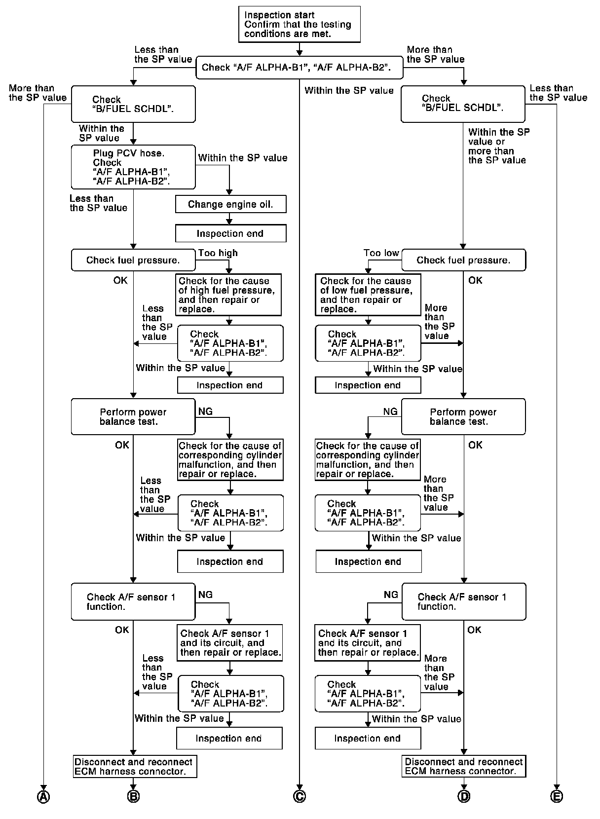 Select "A/F ALPHA-B1", "A/F ALPHA-B2", and "B/FUEL SCHDL" in "SPEC" of "DATA MONITOR" mode, and make sure that each indication is within the SP value.