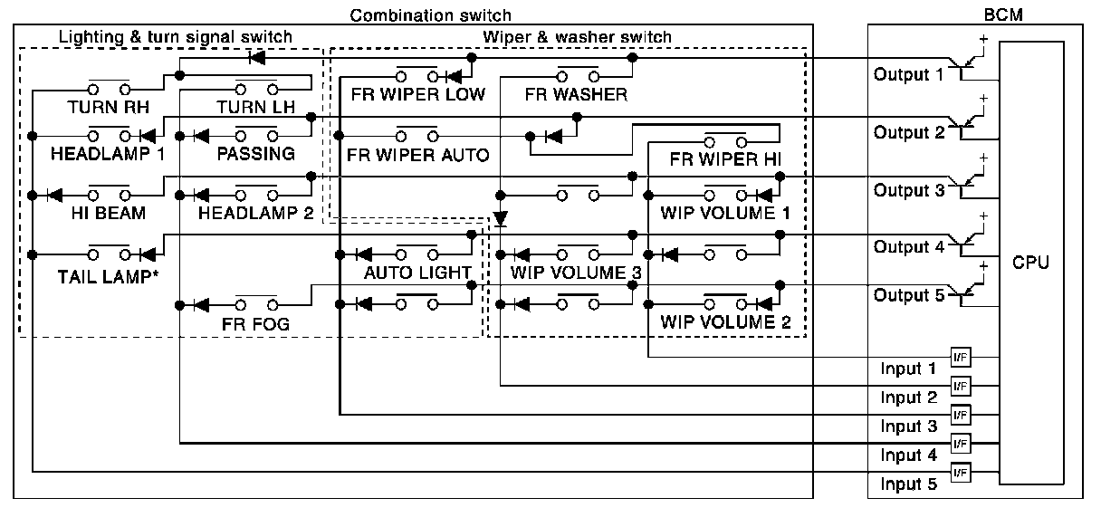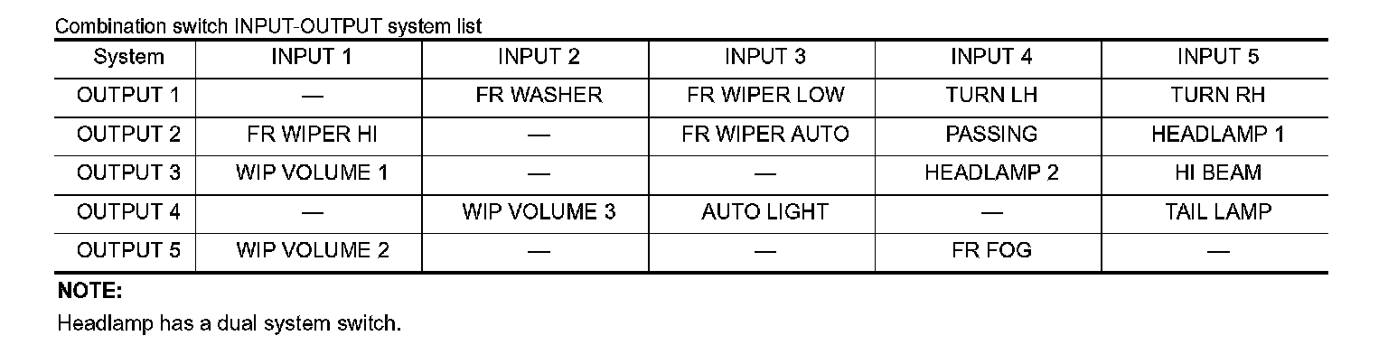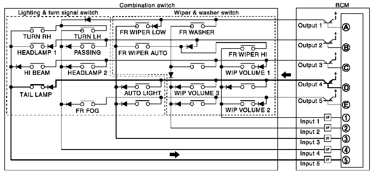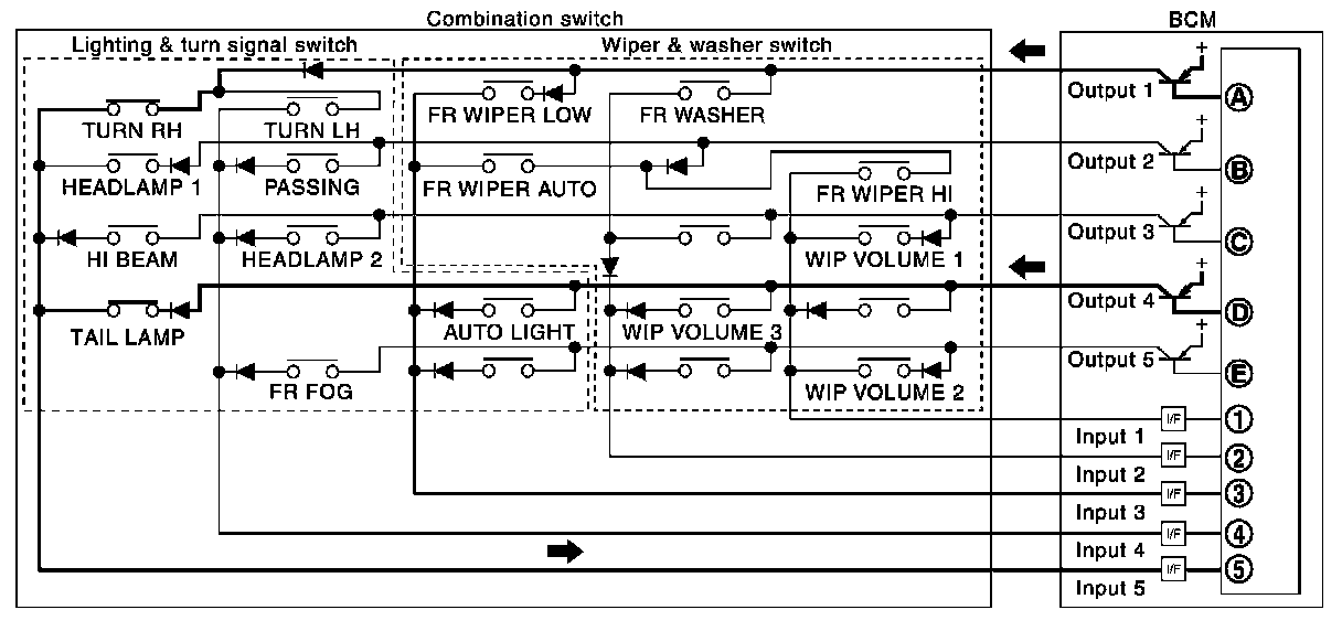 - BCM detects the combination switch status signal "5AD" when the signals of OUTPUT 1 and OUTPUT 4 are input to INPUT 5.