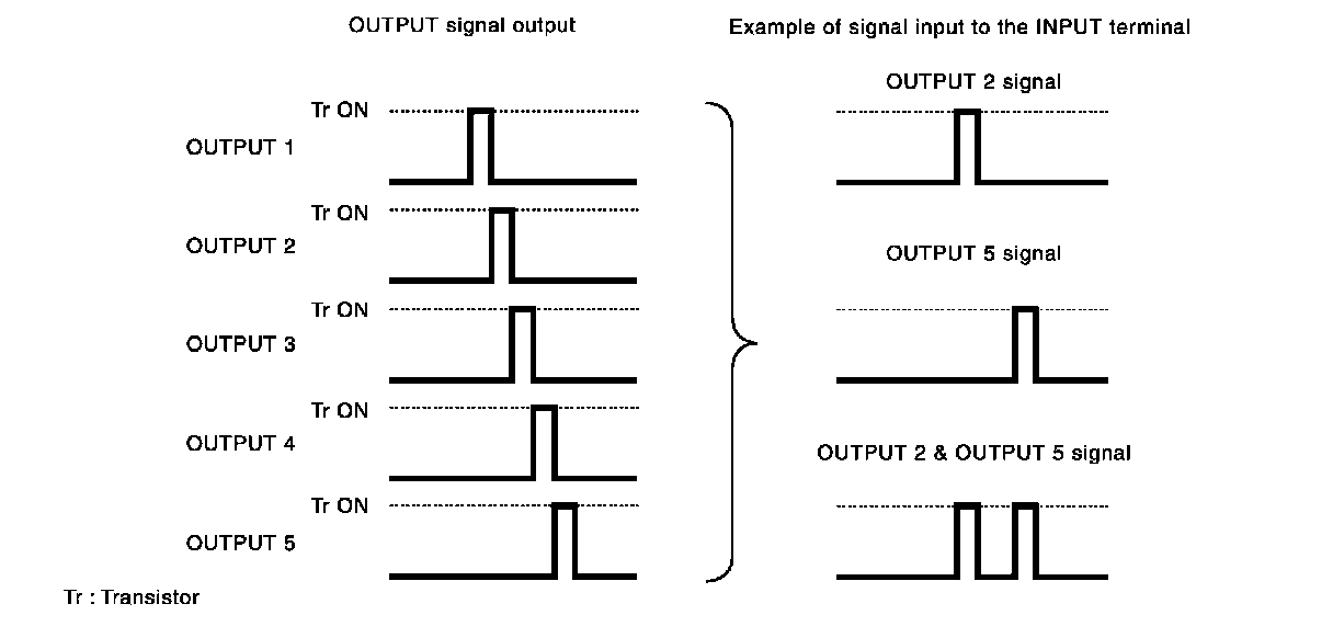 - It operates the transistor on OUTPUT side in the following order: OUTPUT 1 -> 2 -> 3 -> 4 -> 5, and outputs voltage waveform.