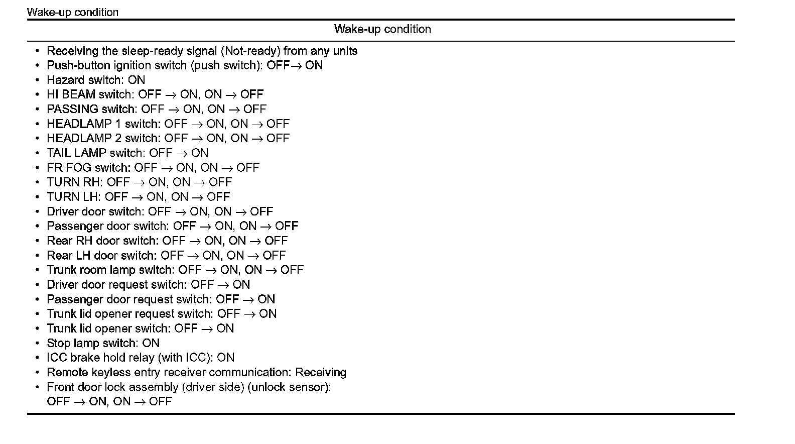 - BCM transmits the sleep wake up signal (sleep) to each unit when all of the CAN sleep conditions are fulfilled.