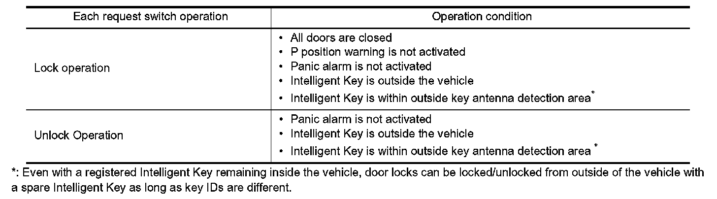 If the following conditions are satisfied, door lock/unlock operation is performed if the request switch is operated.