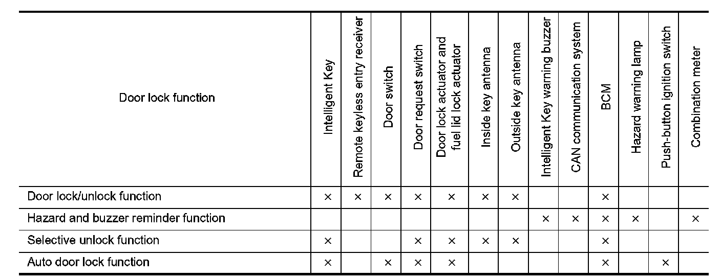 - BCM lock/unlock each door and fuel filler lid and sounds Intelligent Key buzzer warning (lock: 2 time, unlock:
