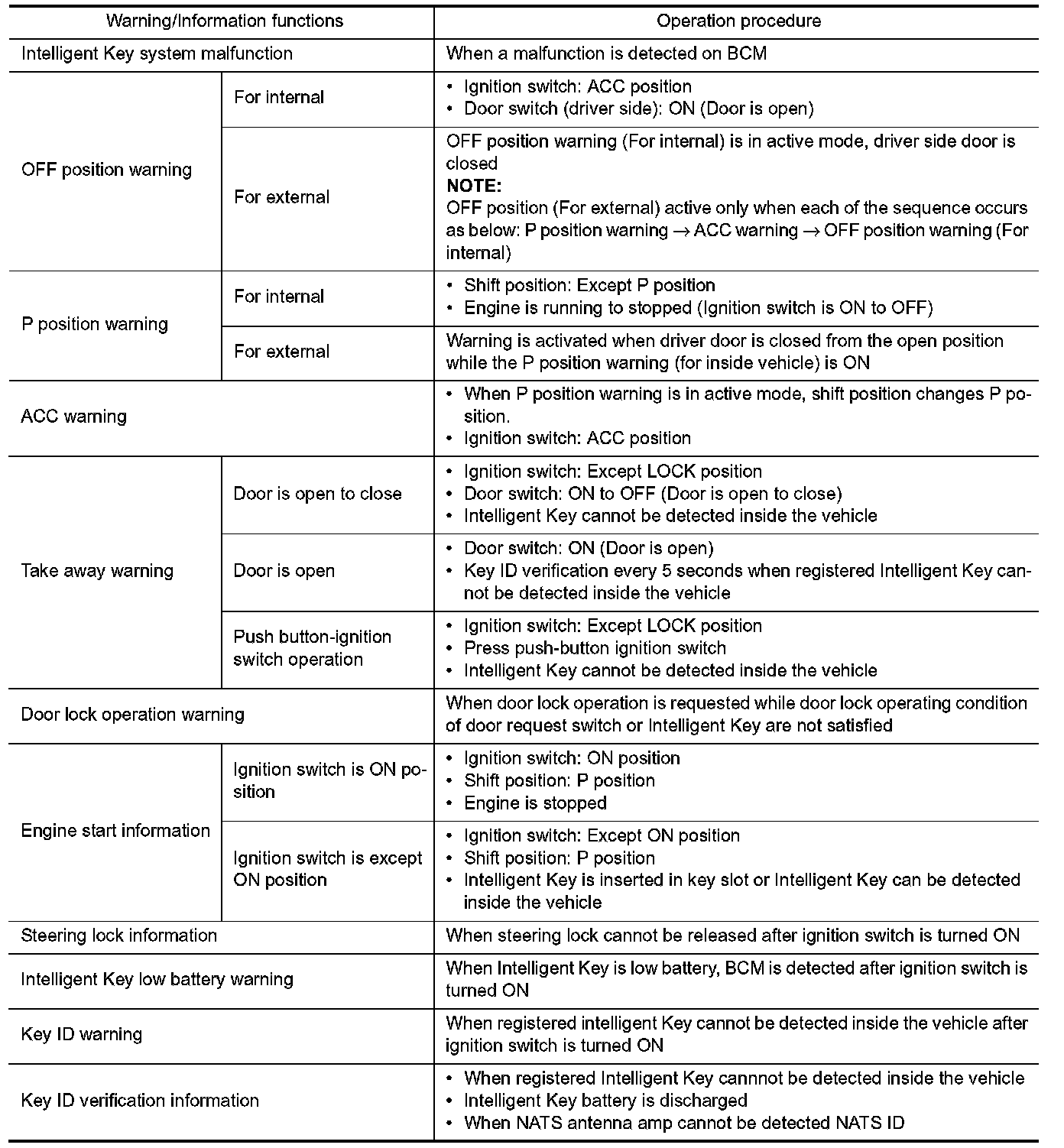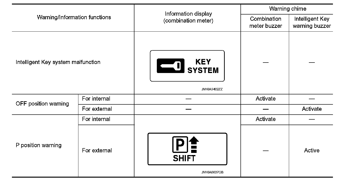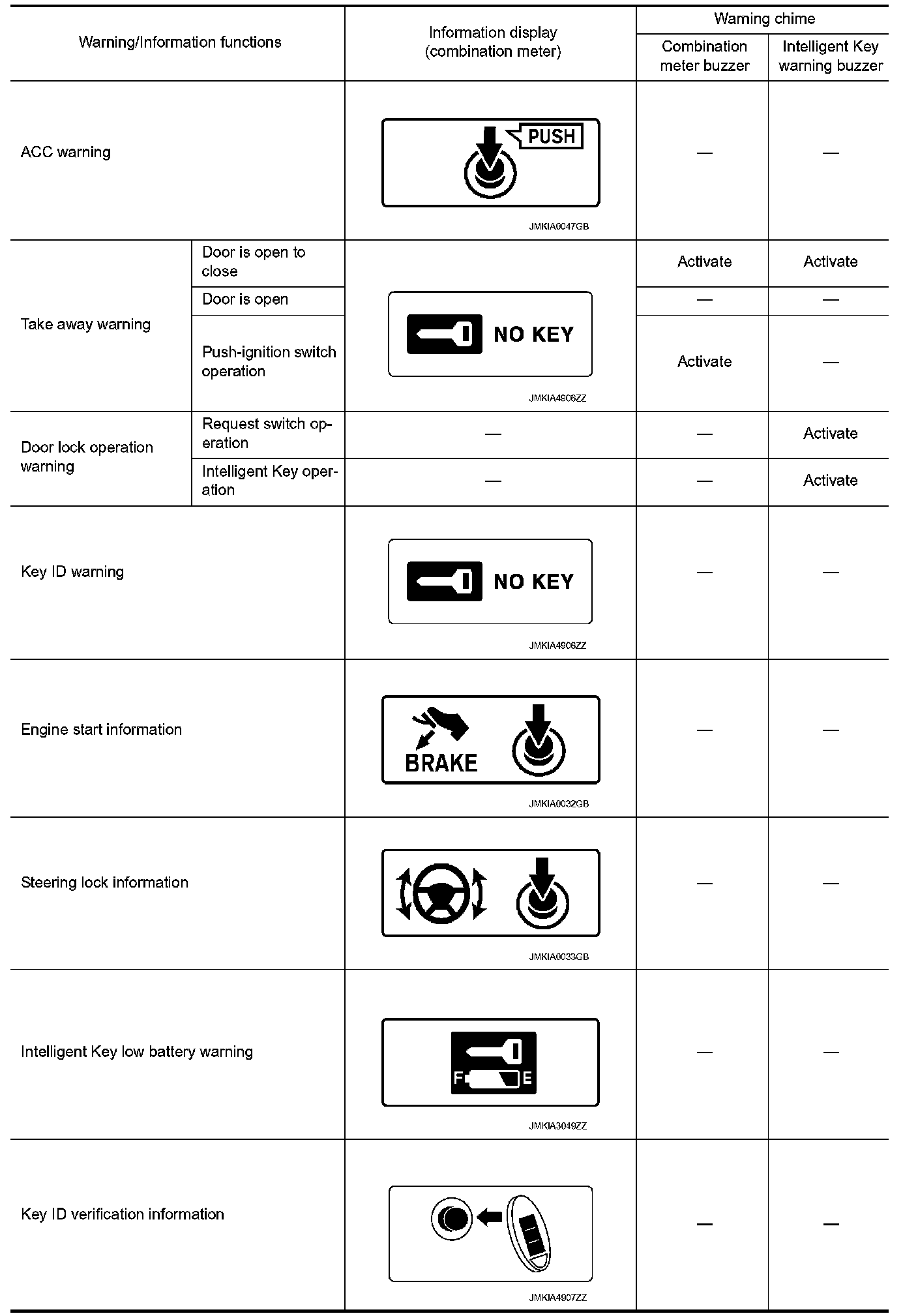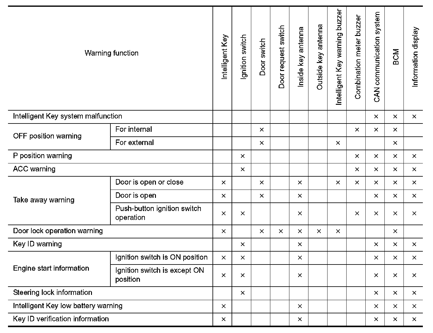 The warning function are as per the following items and are given to the user as warning information and warnings using combinations of Intelligent Key warning buzzer, combination meter buzzer and information display in combination meter.