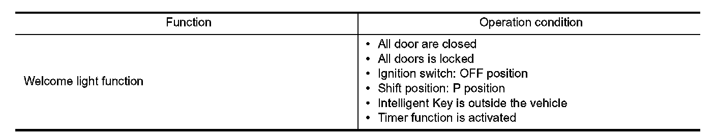 The welcome light function operates as per the following. When the Intelligent Key is carried, and vehicle