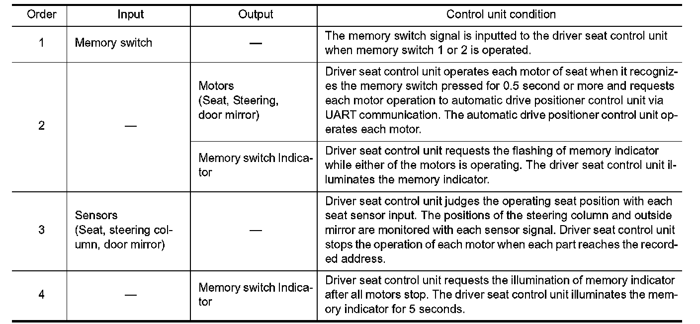 - The memory function can be performed for 45 seconds after opening the driver door even if the ignition switch position is in OFF position.