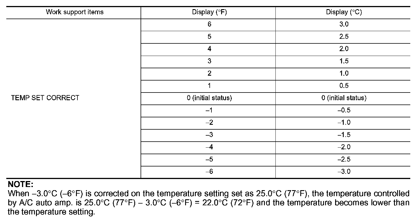 When 3.0�C (-6�F) is corrected on the temperature setting set as 25.0�C (77�F), the temperature controlled by A/C auto amp. is 25.0�