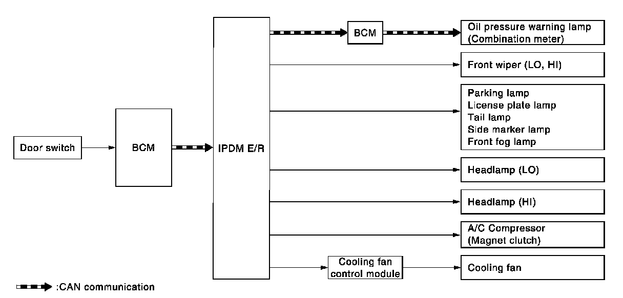 - IPDM E/R starts the auto active test with the door switch signals transmitted by BCM via CAN communication. Therefore, the CAN communication line between IPDM E/R and BCM is considered normal if the auto active test starts successfully.
