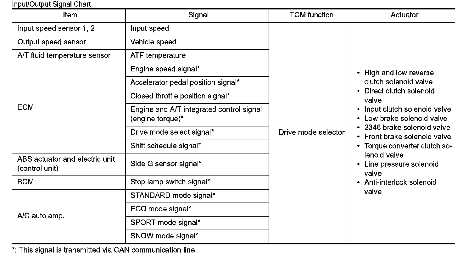 - TCM transmits recognized mode and gear shift line select result to ECM via CAN communication (by drive mode select signal and shift schedule signal).