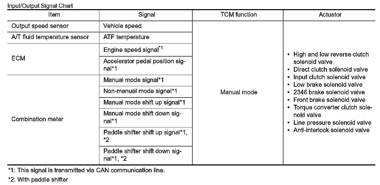 - The TCM receives the manual mode signal, non-manual mode signal, manual mode shift up signal, manual mode shift down signal, paddle shifter shift up signal* and paddle shifter shift down signal* from combination meter via CAN communication line. The TCM shifts shift pattern control to the manual mode based on these signals, and then shifts the A/T by operating each solenoid valve according to the shift operation of the driver.