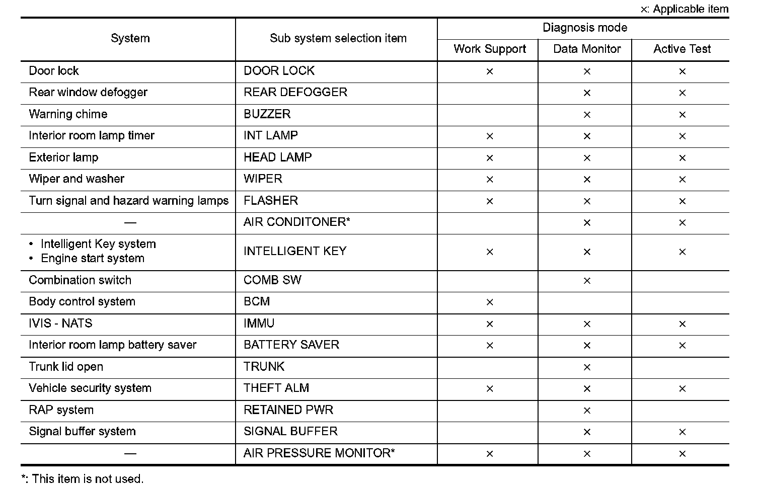 It can perform the diagnosis modes except the following for all sub system selection items.
