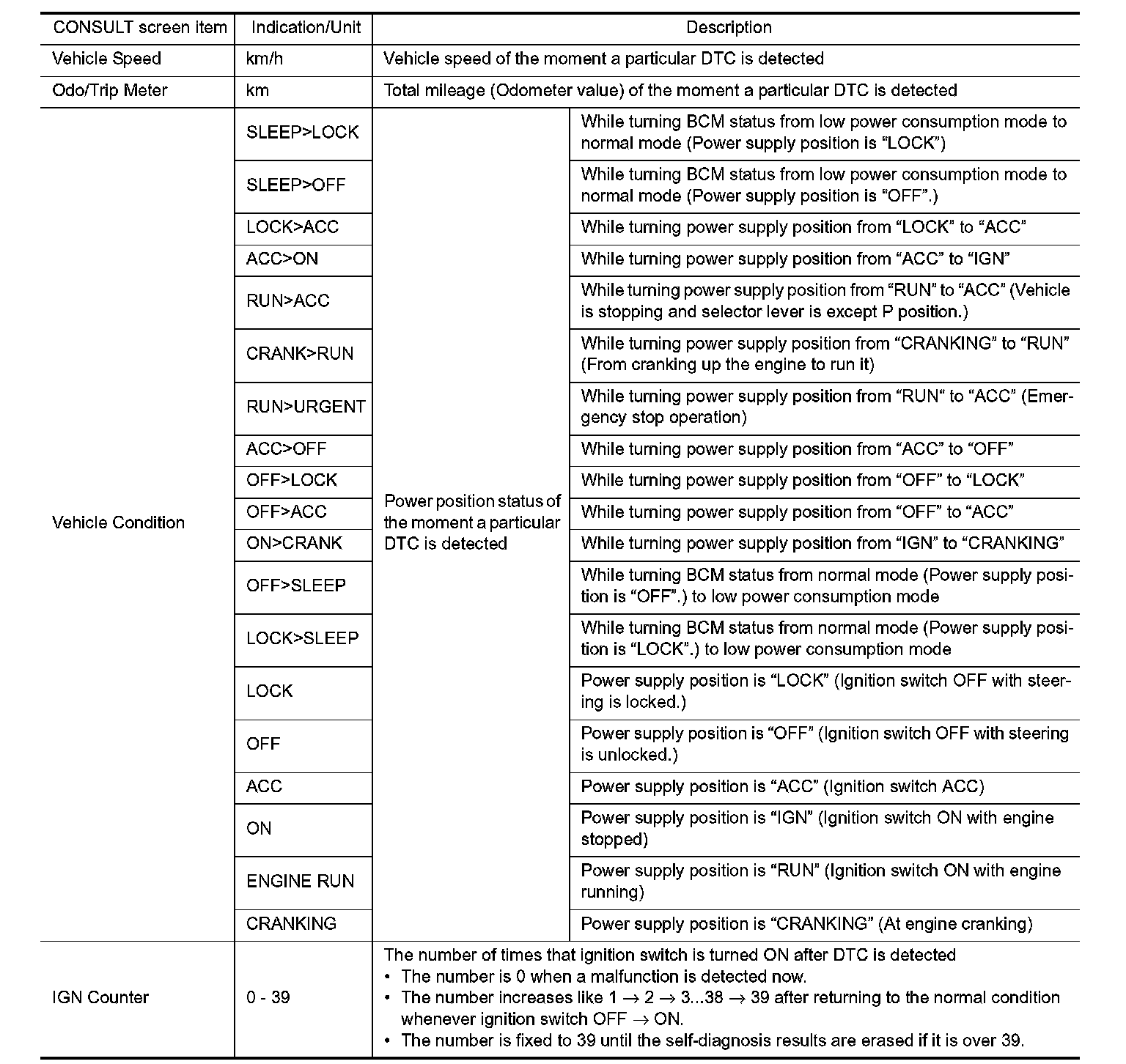 The BCM records the following vehicle condition at the time a particular DTC is detected, and displays on