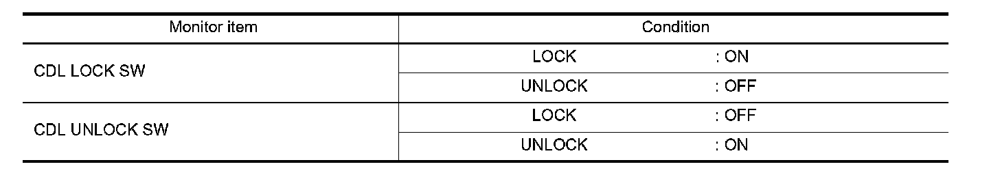 Check ("CDL LOCK SW ", "CDL UNLOCK SW") in "DATA MONITOR" mode for "POWER DOOR LOCK SYSTEM" with CONSULT. CONSULT Function.