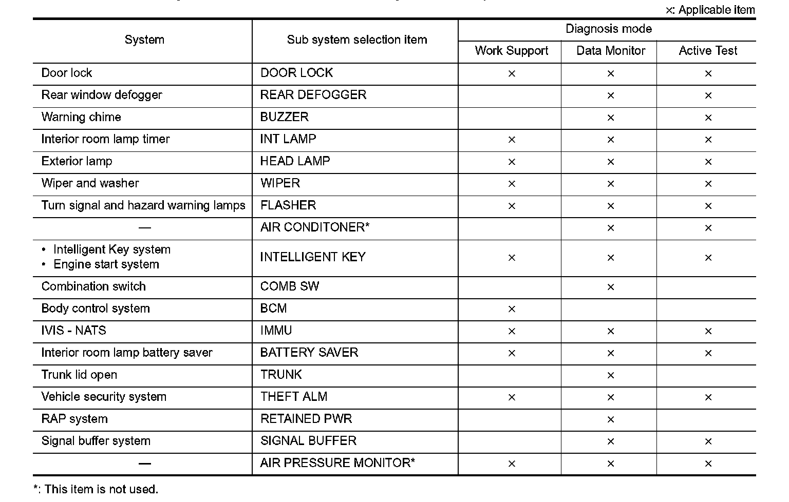 It can perform the diagnosis modes except the following for all sub system selection items.