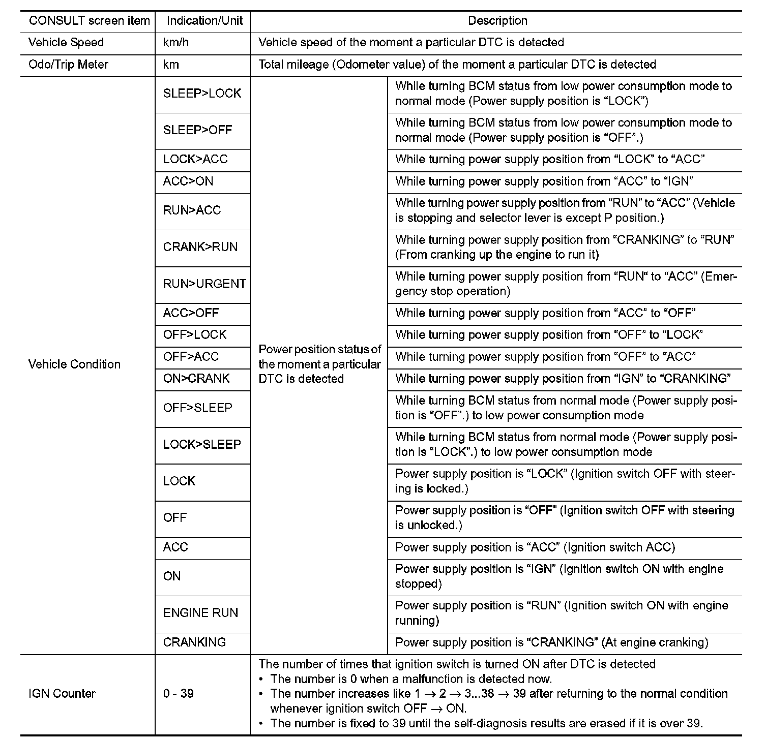 The BCM records the following vehicle condition at the time a particular DTC is detected, and displays on