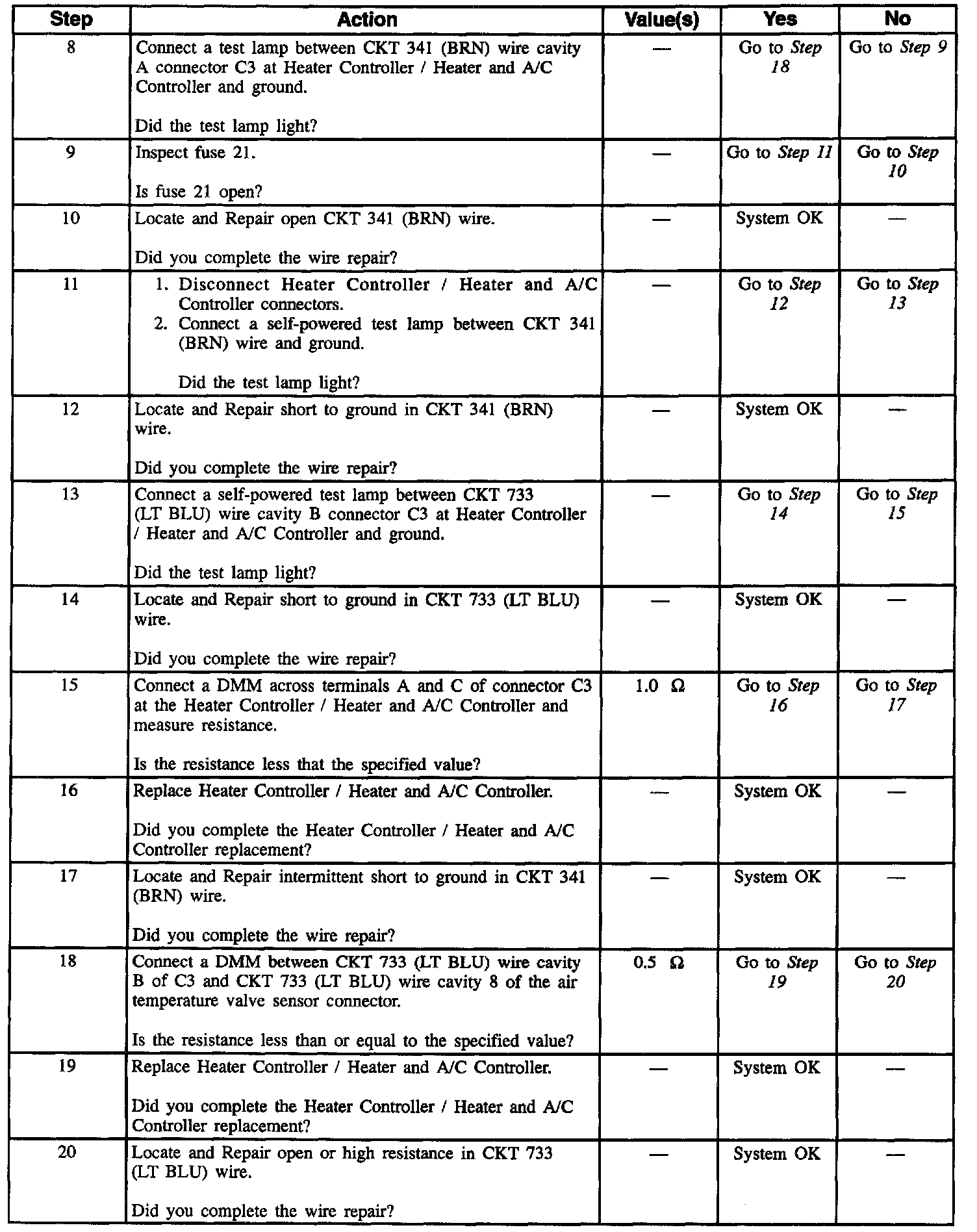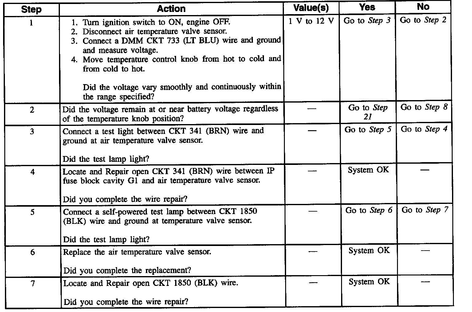 The Air Temperature Valve Sensor positions the temperature door according to the temperature setting of the temperature control on the temperature control /mob. For the full cold temperature setting, the temperature control returns approximately 1.0 Volt to the Air Temperature Valve Sensor. When the temperature setting is changed to full HOT, the temperature door is moved to the warm position, and the output rises to about 12 Volts. For a temperature setting in the mid range, the temperature door positions itself according to the voltage supplied through the temperature control switch. Should the motor stall when changing the door location, voltage is removed by the Heater Controller / Heater and A/C Controller after 45 seconds to protect the motor.