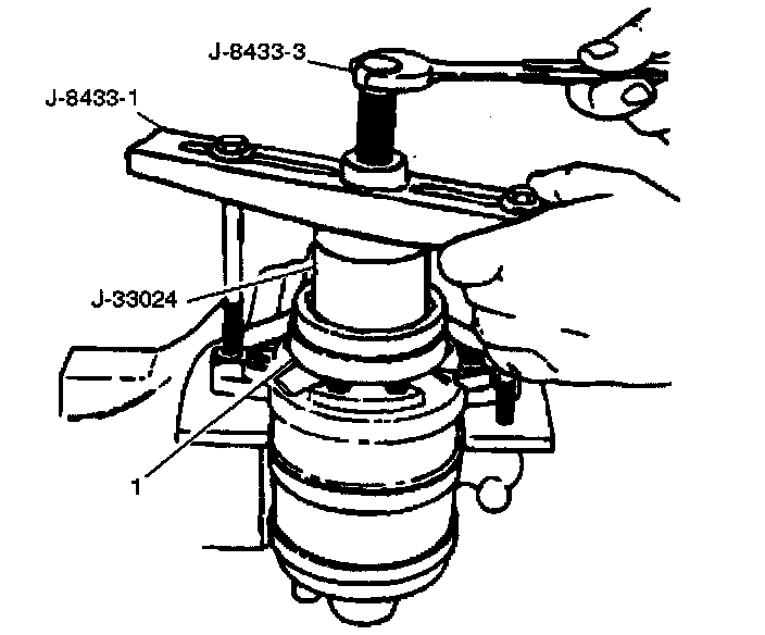 4. Turn the center forcing screw of J-8433-1 puller crossbar to force the clutch coil onto the front head. Be sure clutch coil and J-33024 installer stay in-line during installation.