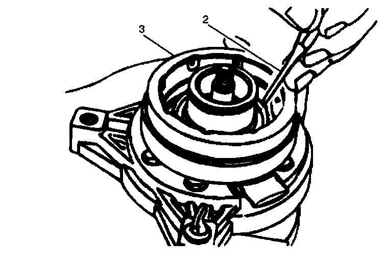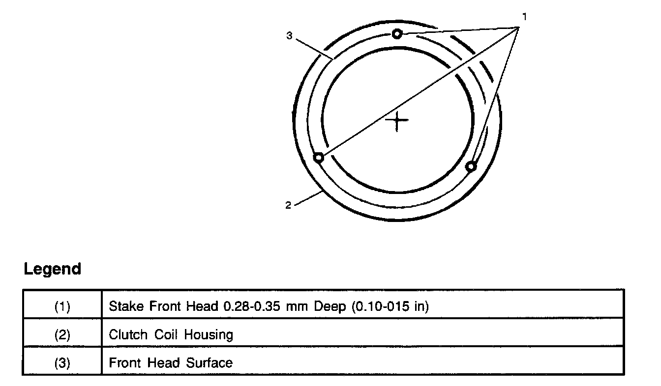 5. When coil is fully seated on the front head, use a 1/8 in diameter drift punch (2) and stake the front head at three places 120 degrees apart, to ensure clutch coil (3) remains in position.