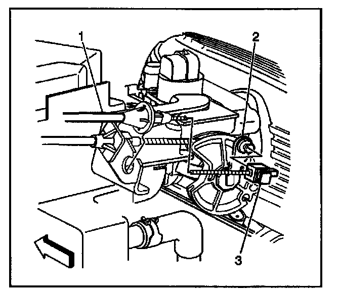 3. In order to release the tension on the cruise control adjuster, rotate the cam lever. Disconnect the cruise control cable adjuster (3) from the nail head on the throttle cam lever.