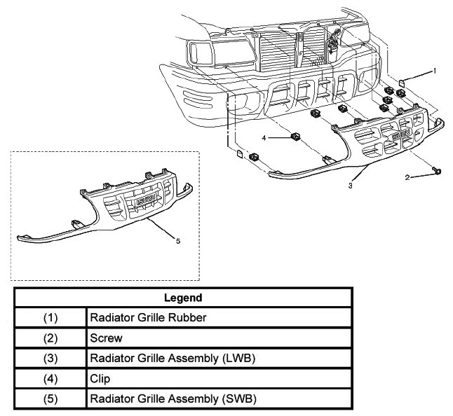 1. Install the radiator grille clips remaining on the body side in the radiator grille and then install the radiator grille on the body.