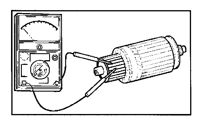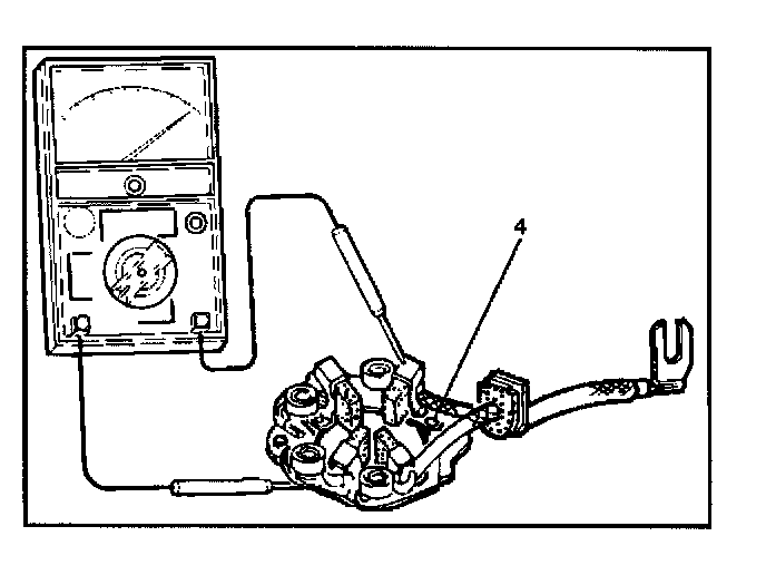 Check for continuity between brush holder (+) (4) and base (-). Replace, if there is continuity (i.e., insulation is broken).