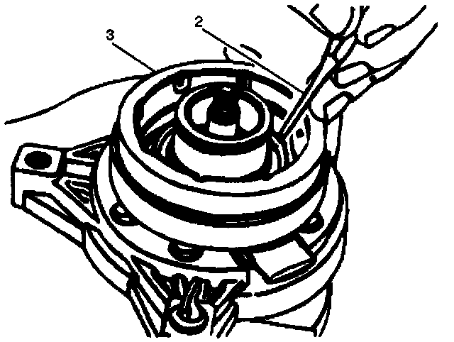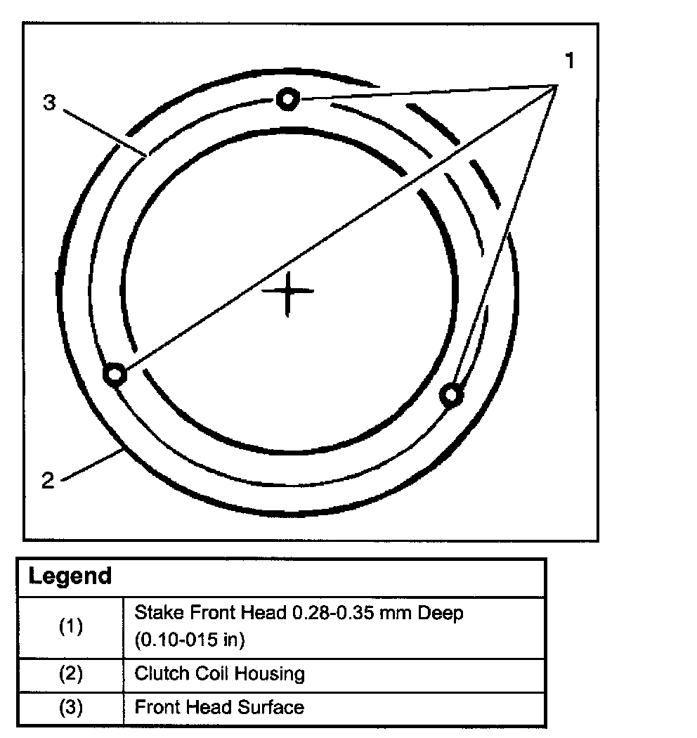 5. When coil is fully seated on the front head, use a 1/8 in diameter drift punch (2) and stake the front head at three places 120 degrees apart, to ensure clutch coil (3) remains in position.