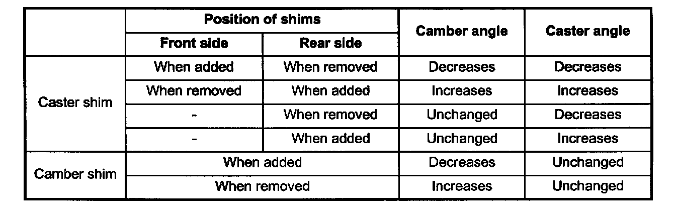 Note: Difference of the caster shim front/rear thickness should be 3.6 mm (0.142 inch) or less. Overall thickness of caster shim and camber shim should be 10.8 mm (0.425 inch) or less.