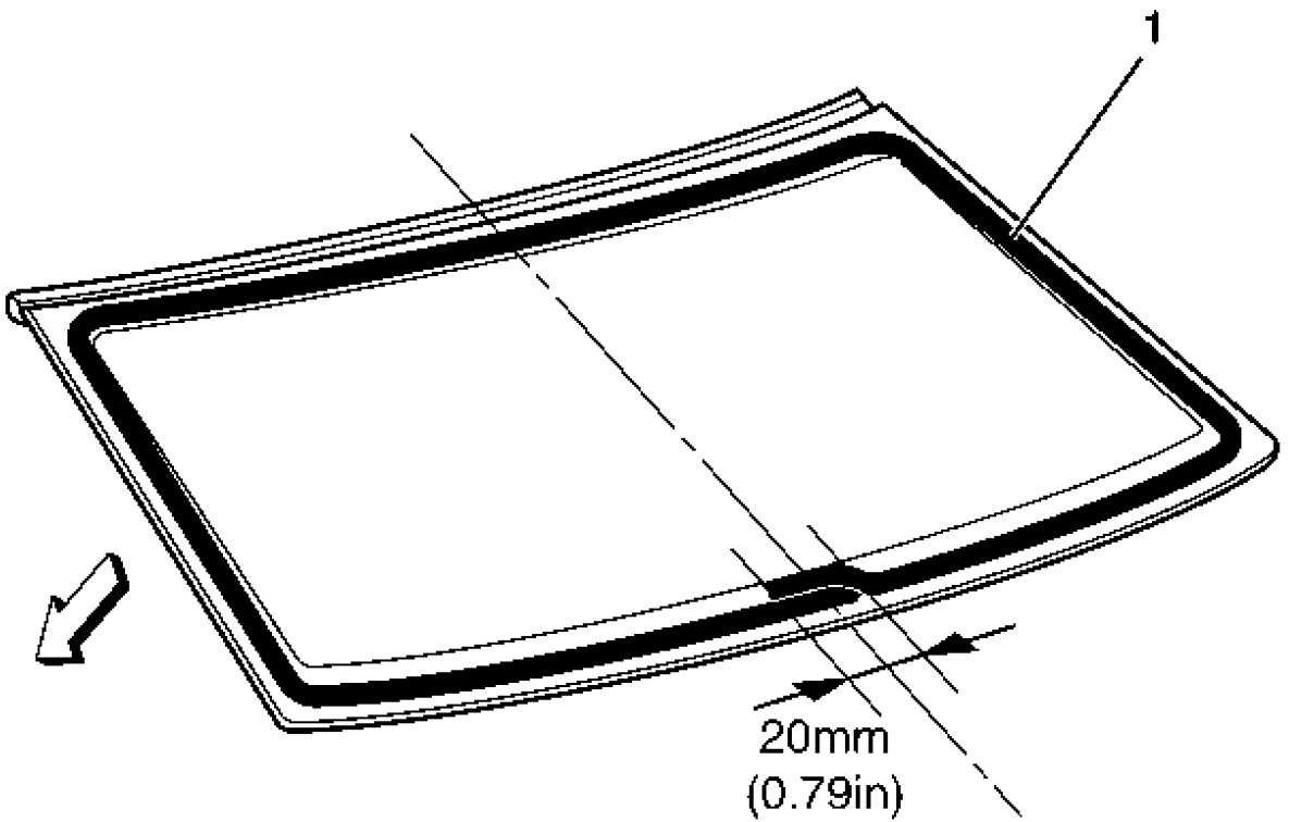 - After drying primer completely, apply a sealing adhesive (1) (Sun star #555 or equivalent) along the edge of the glass so that the sealing adhesive has a 20 mm (0.79 in) junction at middle of the base of the glass.