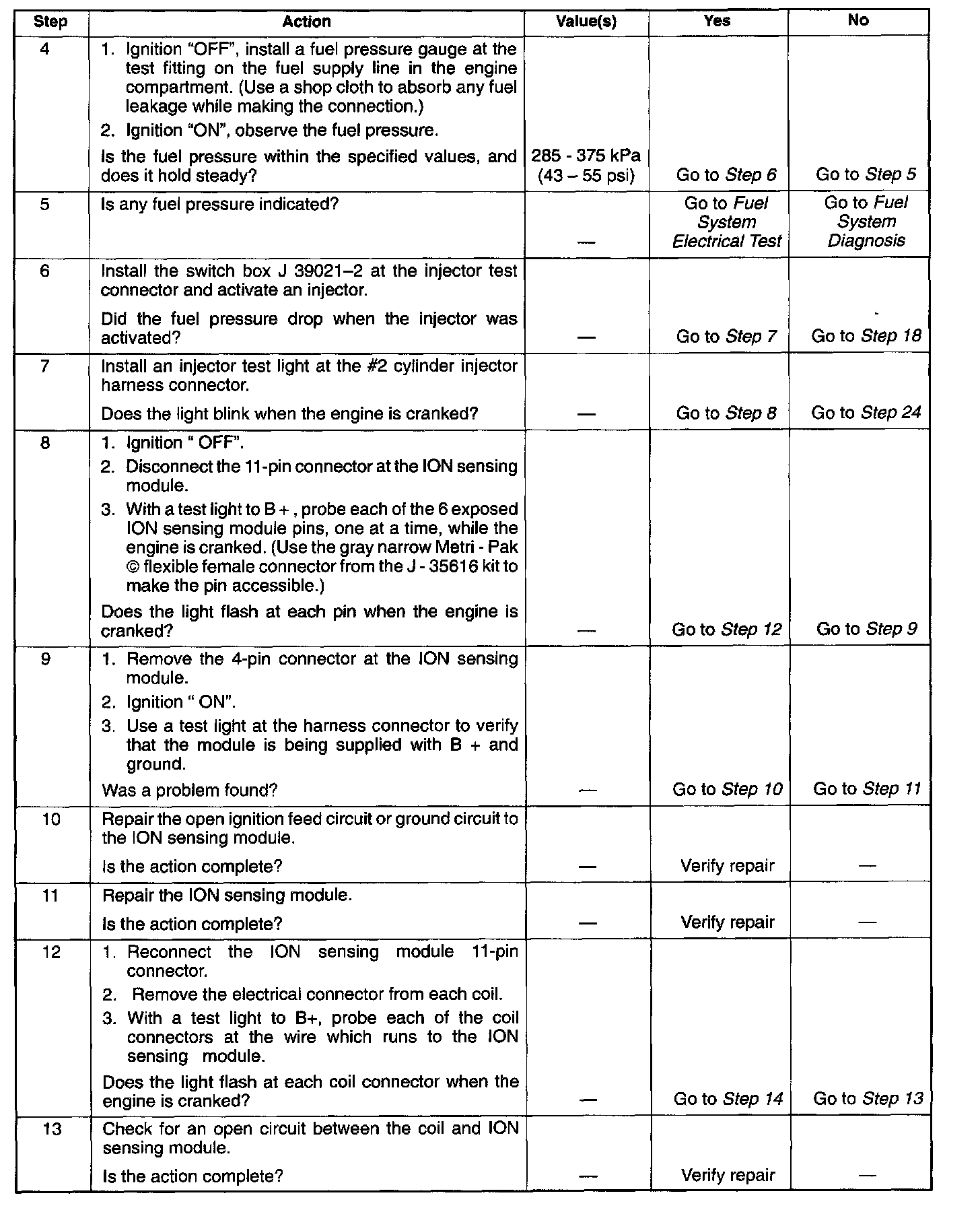 25. If there is an open or shorted driver circuit, DTCs 201 - 206 and a misfire DTC 301 - 306 should be set. All six injector driver circuits can be checked at one time without removing the intake manifold if a J39021 - 95 test light is available. This is the alternative procedure: