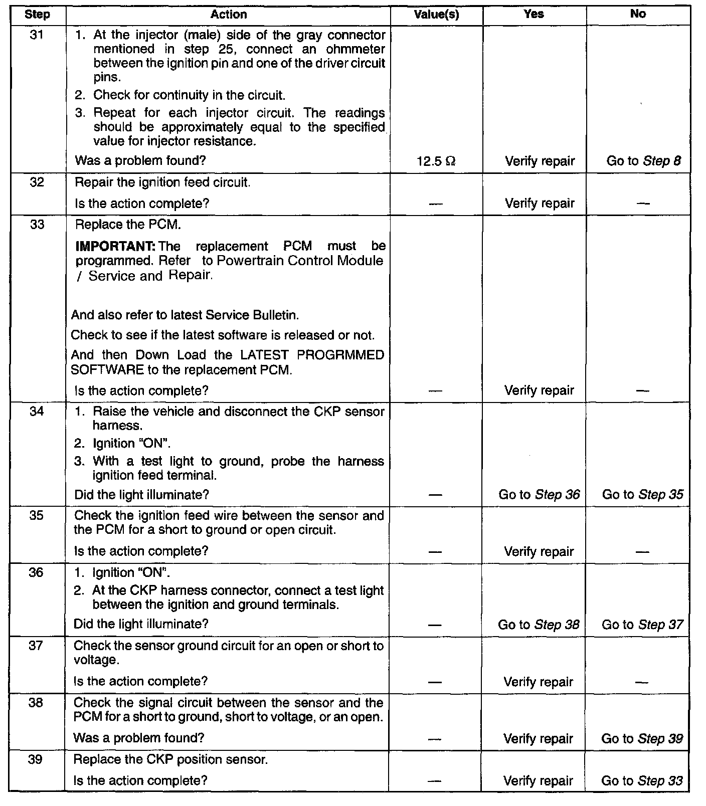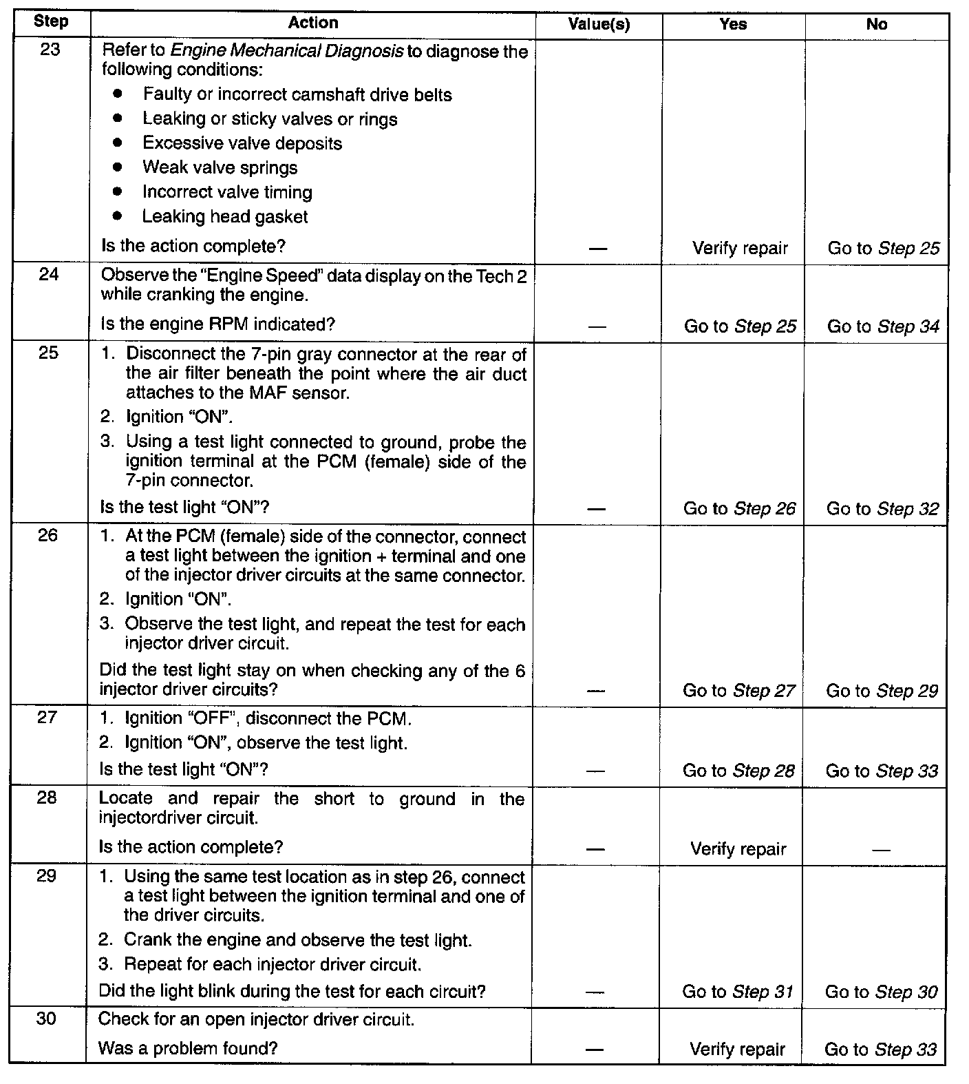 This procedure only tests the driver circuit as far as the test connection, so step 31 is added to test the circuit all the way to the injector.