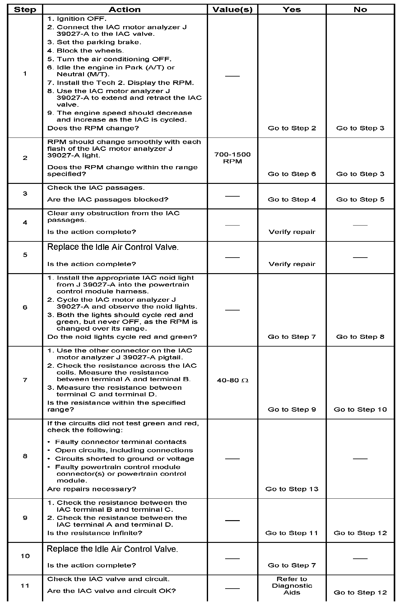 - Vacuum leak (high idle) - If idle is too high, stop the engine. Fully extend (low) IAC with the IAC motor analyzer J 39027-A. Start the engine. If idle speed is above 800 RPM, locate and correct the vacuum leak, including the PCV system. Check for binding of the throttle blade or linkage.